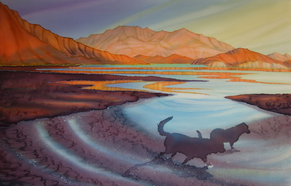 "#428 Water Dog Series III, Morning Tide with 2 Labs" dye on silk 38" x 28" framed