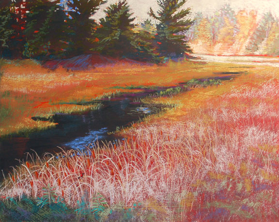 #471 "Sunset Creek" watercolor and pastel on sanded board framed 22" x 18"